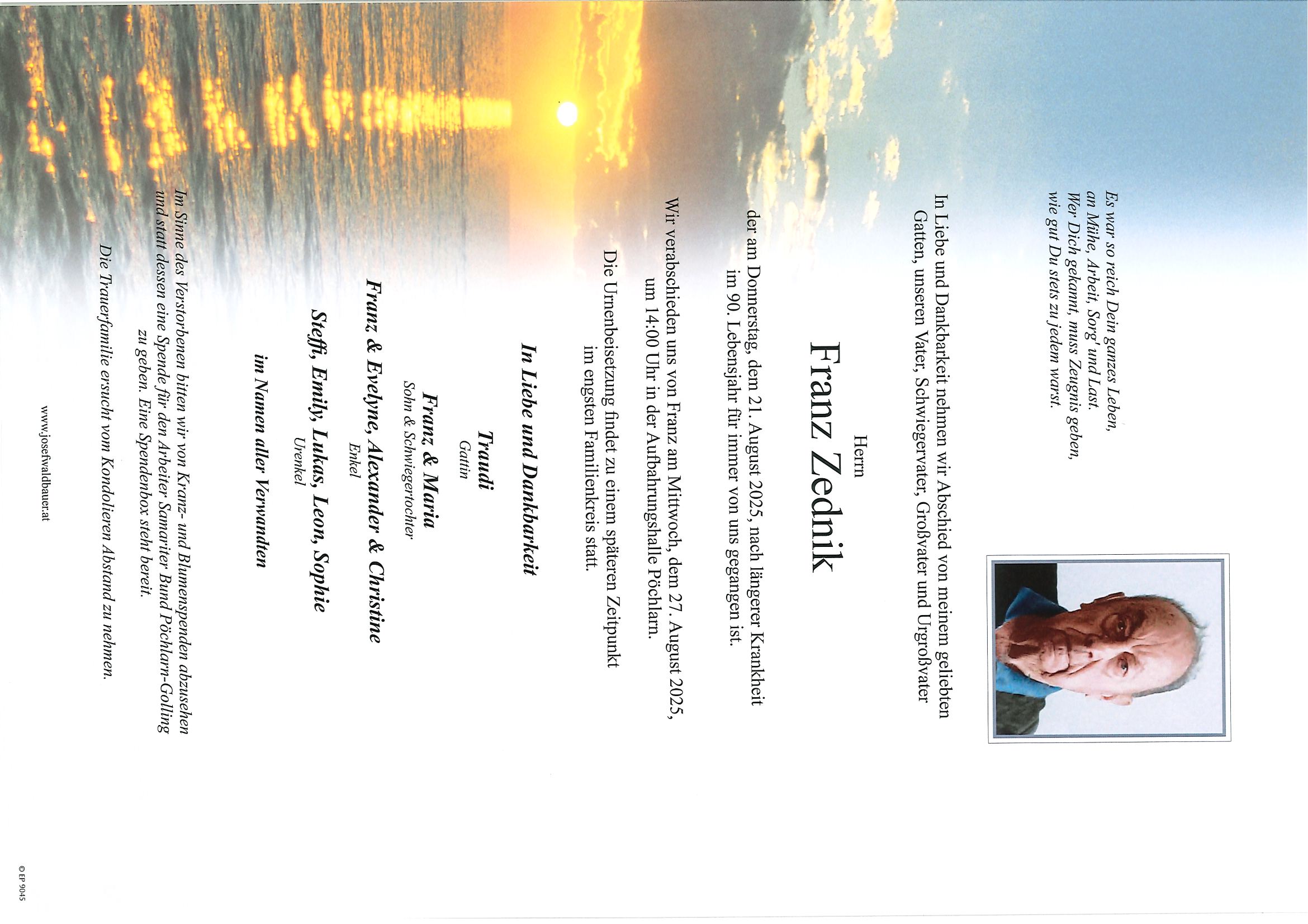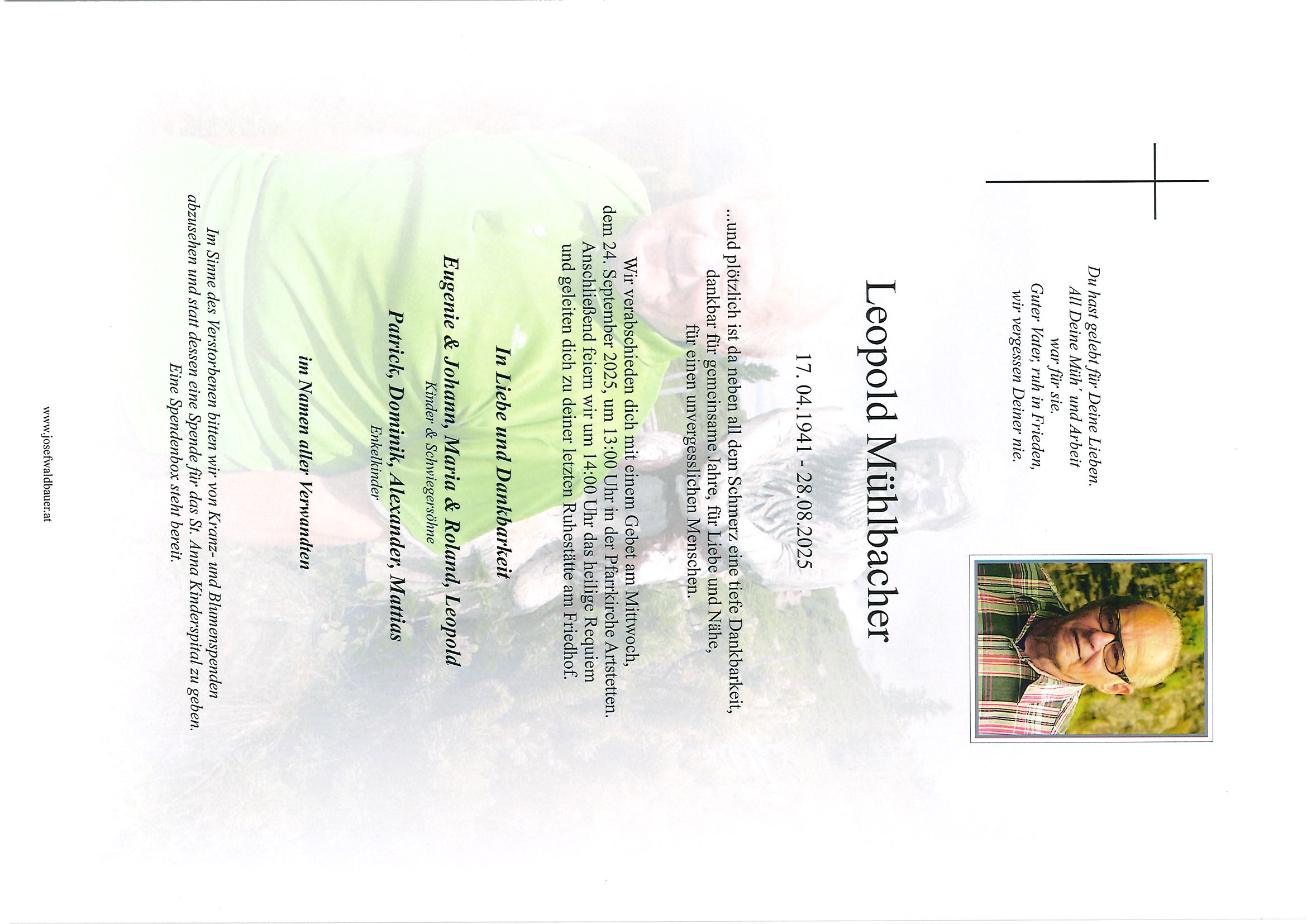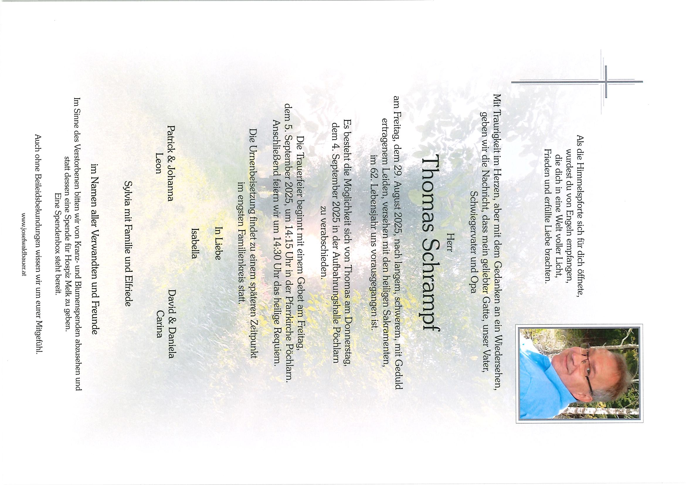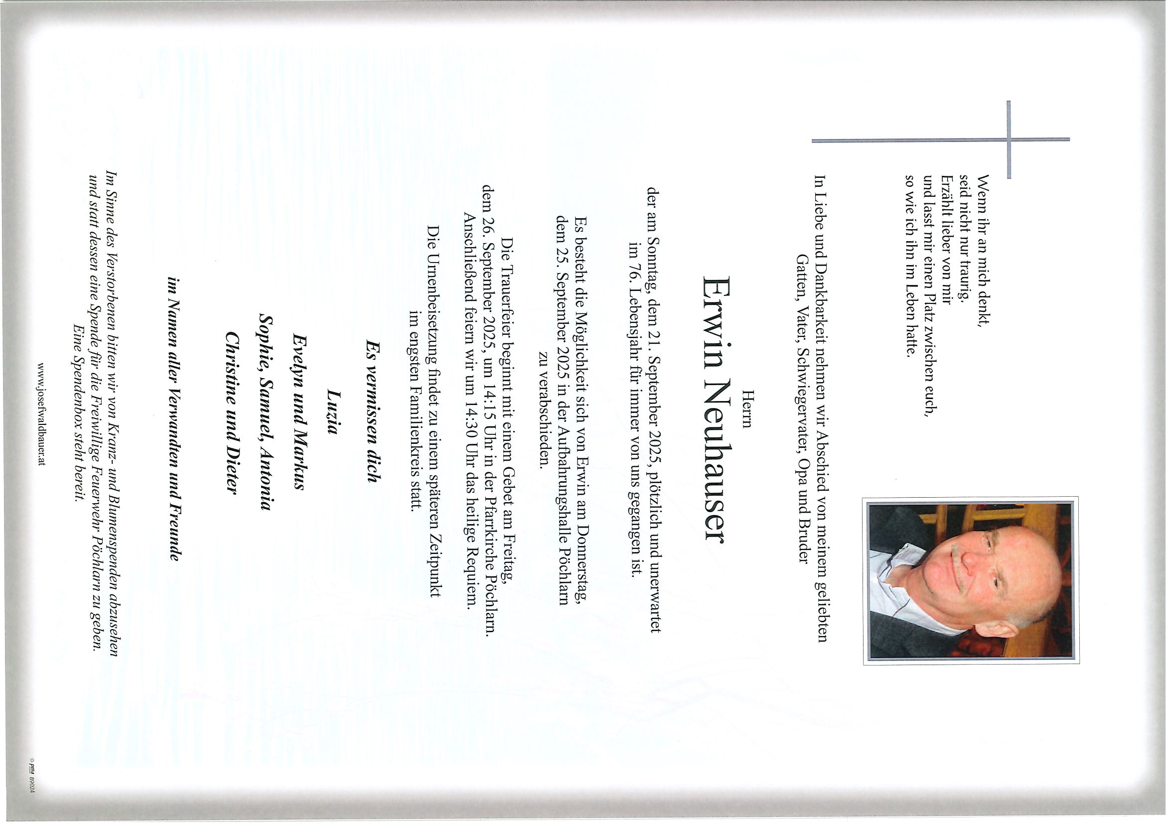 Zum Andenken an unsere nahen Angehörigen, lieben Freunde und besonderen Menschen in unseren Gemeinden veröffentlichen wir hier die Parten samt zugehöriger Daten. Die Veröffentlichung findet selbstverständlich nur mit dem Einverständnis der Hinterbliebenen statt.