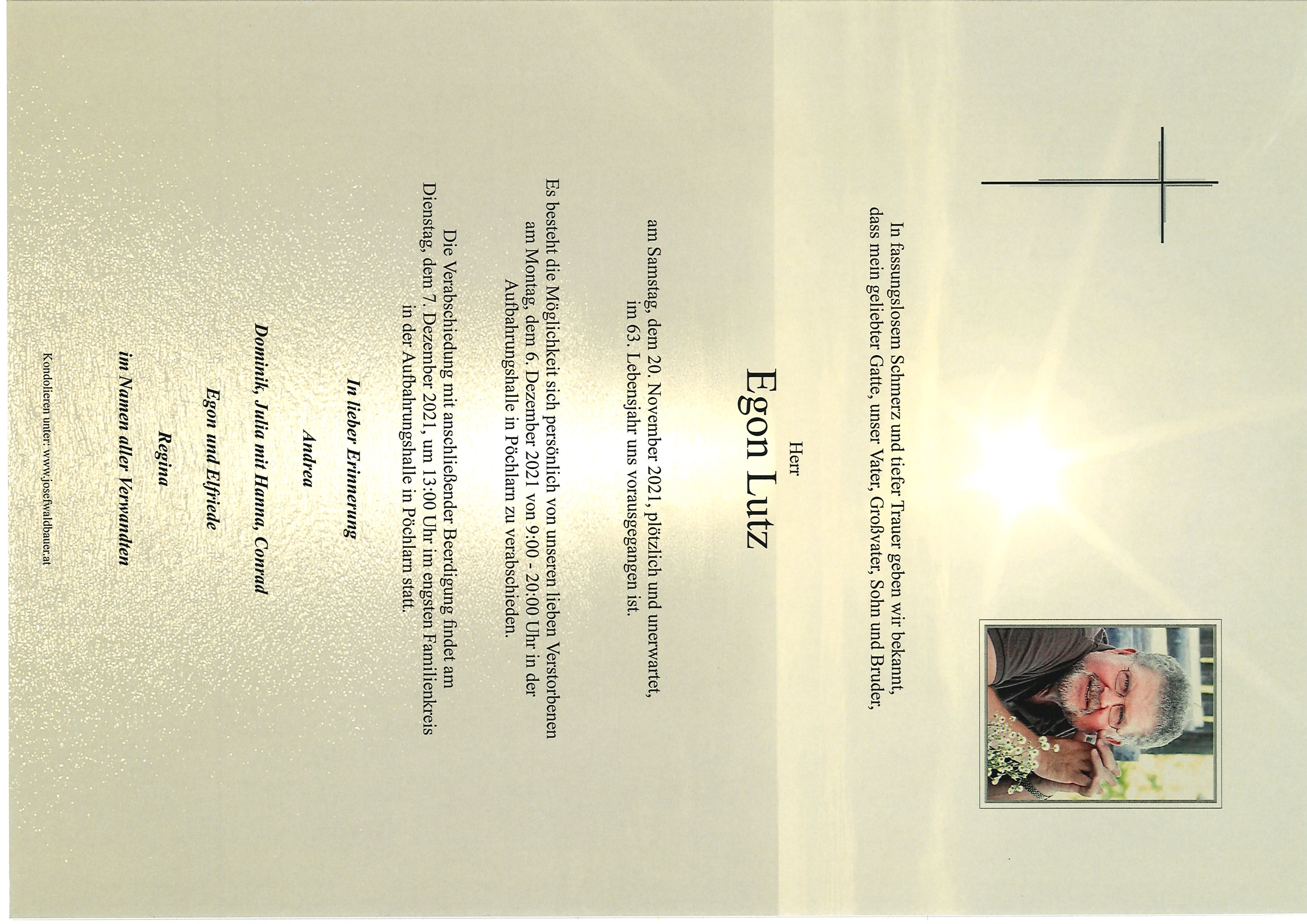 Liebe Trauerfamilie, das unerwartet frühe Ableben von Herrn Egon Lutz macht auch uns sehr betroffen. Unser aufrichtige Anteilnahme! Alfred und Christa Schweiger, Krummnußbaum